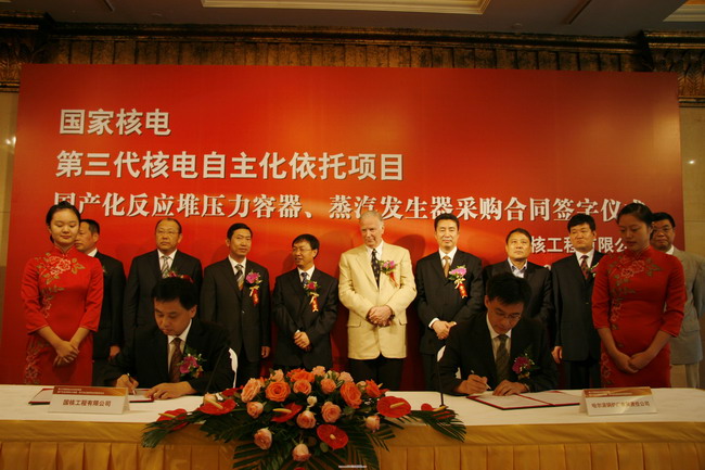 9月26日,哈電集團哈爾濱鍋爐廠有限責(zé)任公司和國核工程有限公司在上海虹橋迎賓館簽定了我國三代核電自主化依托項目三門核電站2號機組最重要的核島主設(shè)備——首臺國產(chǎn)化蒸汽發(fā)生器供貨合同。國家核電技術(shù)公司、上海核工程研究設(shè)計院、國核電站運行服務(wù)技術(shù)公司、國核自儀系統(tǒng)工程有限公司、三門核電有限公司、AP1000核島聯(lián)合項目管理機構(gòu)JPMO等參加了簽字儀式。哈電集團副總經(jīng)理、哈動股份公司總經(jīng)理曲大莊致辭,哈爾濱鍋爐廠有限責(zé)任公司副總經(jīng)理王守革在合同上簽字。哈動股份公司副總經(jīng)理韓建偉、核電事業(yè)部及鍋爐公司有關(guān)人員參加了簽字儀式。